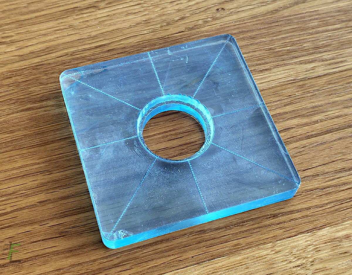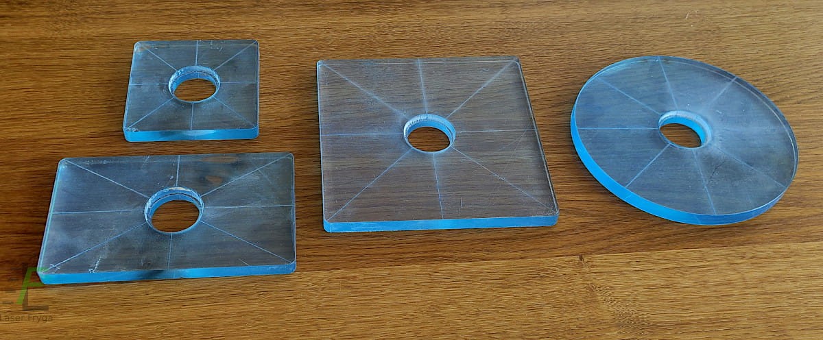 Stopy wykonane z plexi (PMMA) o grubości 10mm lub 6mm z otworem centralnym o średnicy 30mm. Do użycia z tulejkami kopiującymi lub bez.